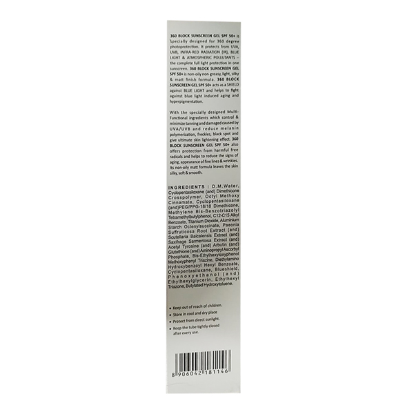 360 BLOCK SPF 50+ Sunscreen Gel offers broad-spectrum UVA and UVB protection to shield your skin from harmful sun rays. Its lightweight, non-greasy gel formula absorbs quickly, leaving no white cast—perfect for daily wear under makeup or on its own. Enriched with skin-friendly ingredients, it helps prevent sunburn, tanning, and premature aging caused by sun exposure. Water-resistant and dermatologist-tested, this sunscreen is ideal for all skin types, including sensitive skin.