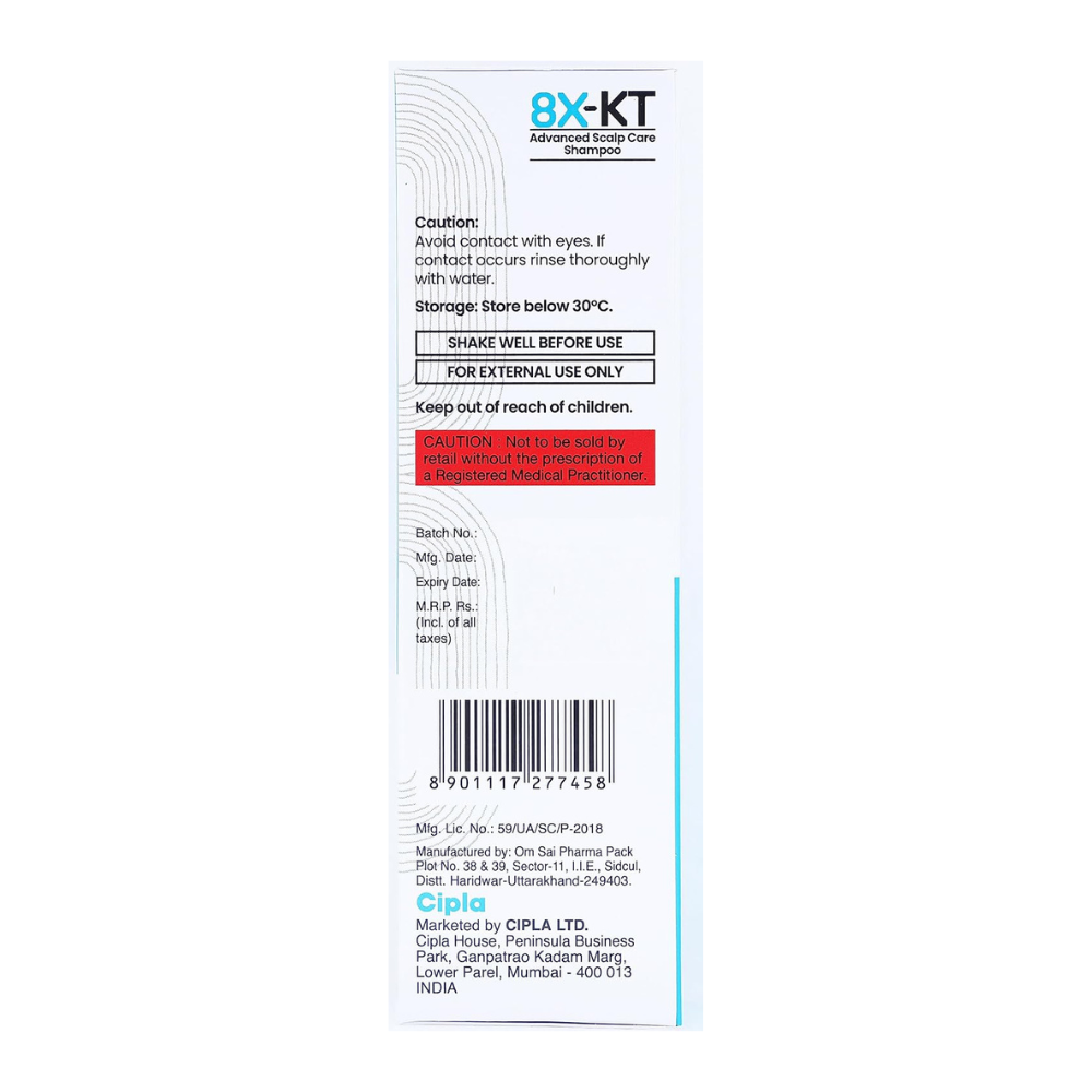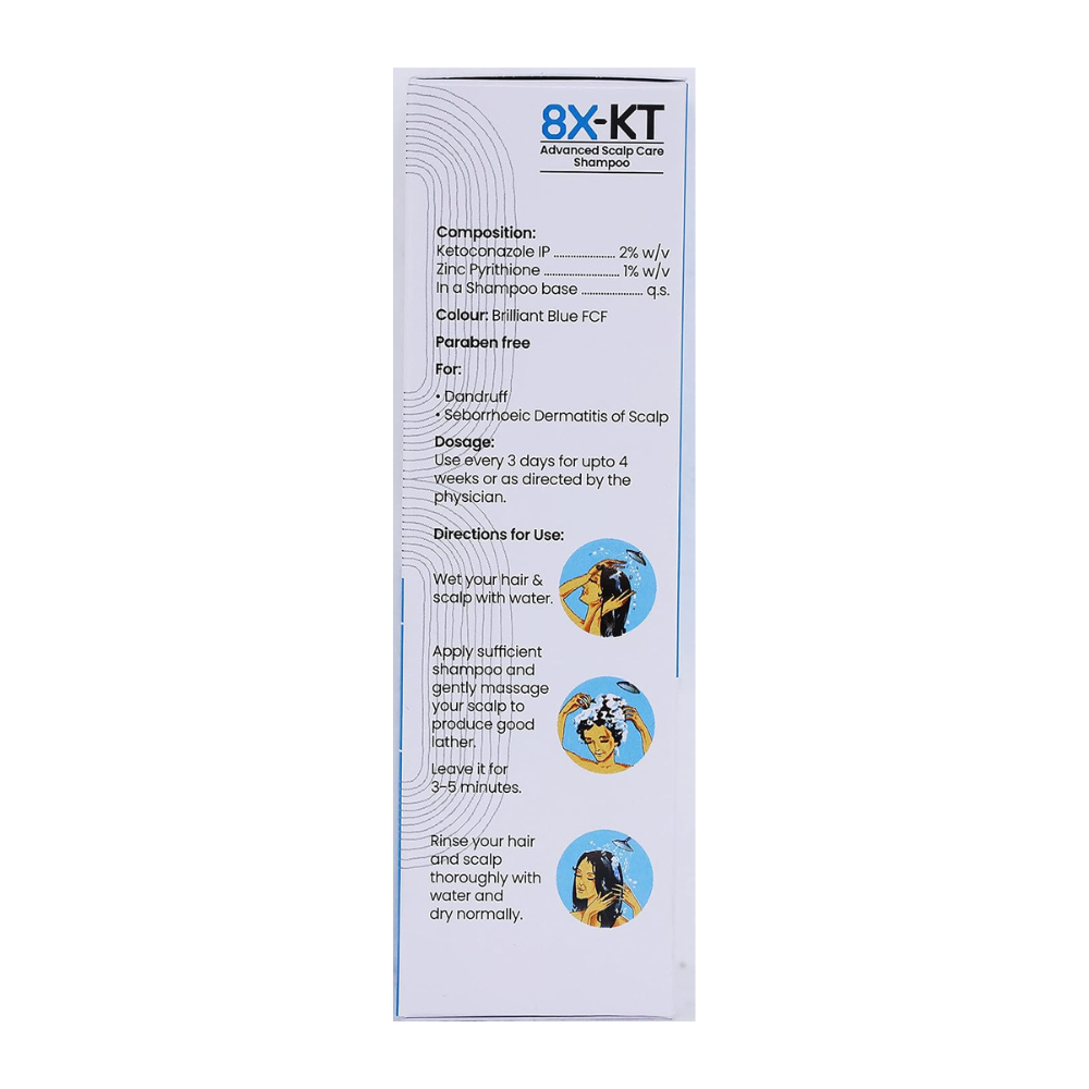 8X-KT Advanced Scalp Care Shampoo is a specialized hair care formula designed to support scalp health and comfort. This 100ml shampoo combines key active ingredients to address common scalp concerns and maintain a balanced scalp environment. Key Features: – Contains 2% ketoconazole and 1% zinc pyrithione – Gentle cleansing formula – Helps maintain natural scalp moisture balance – Suitable for regular use How to Use: Apply to wet hair and massage gently into the scalp. Leave on for 3 to 5 minutes, then rinse thoroughly. Use as directed for best results. Technical Specifications: – Volume: 100ml – Active ingredients: Ketoconazole 2%, Zinc pyrithione 1% – Application: External use only – Storage: Keep in a cool, dry place away from direct sunlight Care Instructions: Discontinue use if irritation occurs and consult a healthcare professional. Follow prescribed usage duration as advised by your healthcare provider. This product is formulated to support scalp wellness when used as directed.