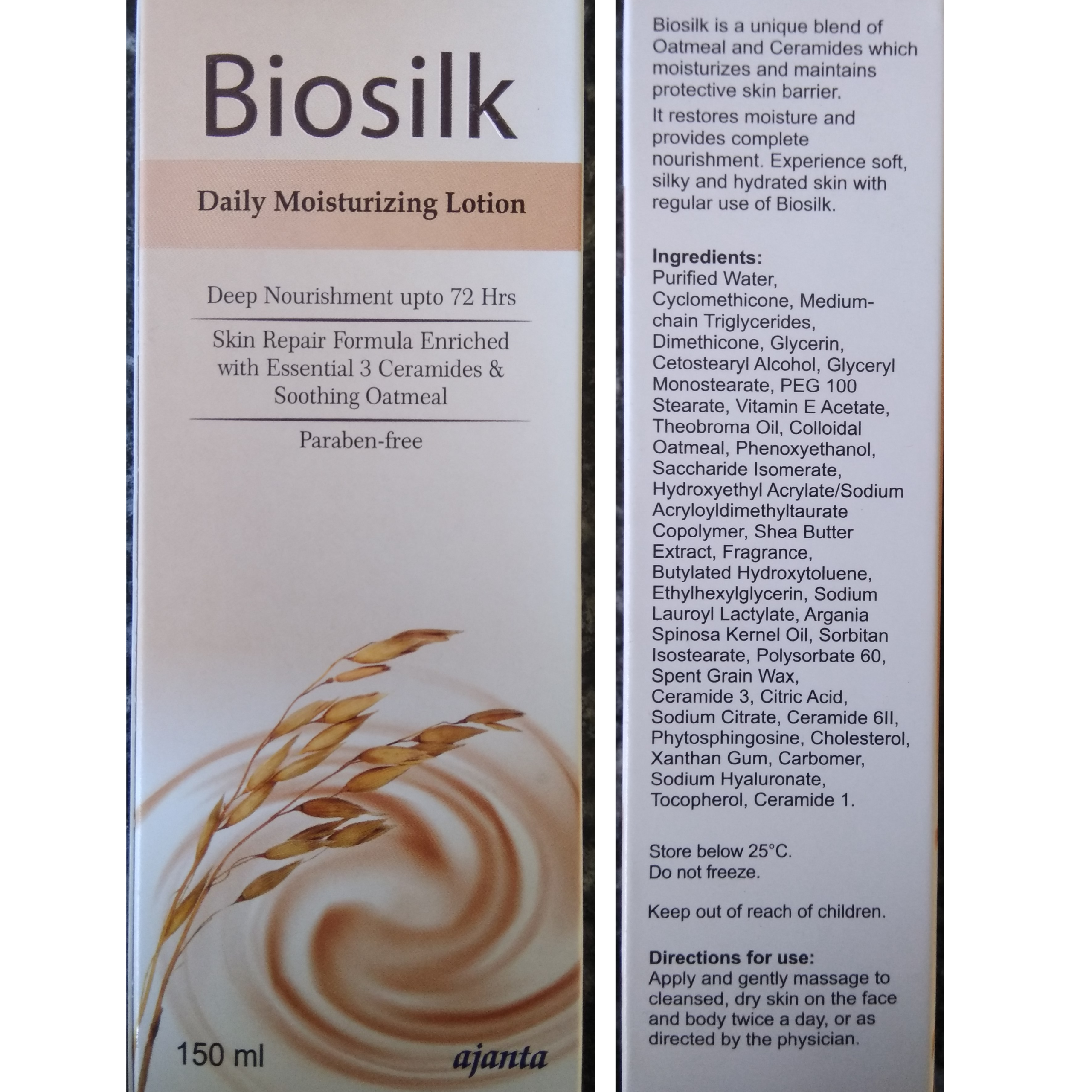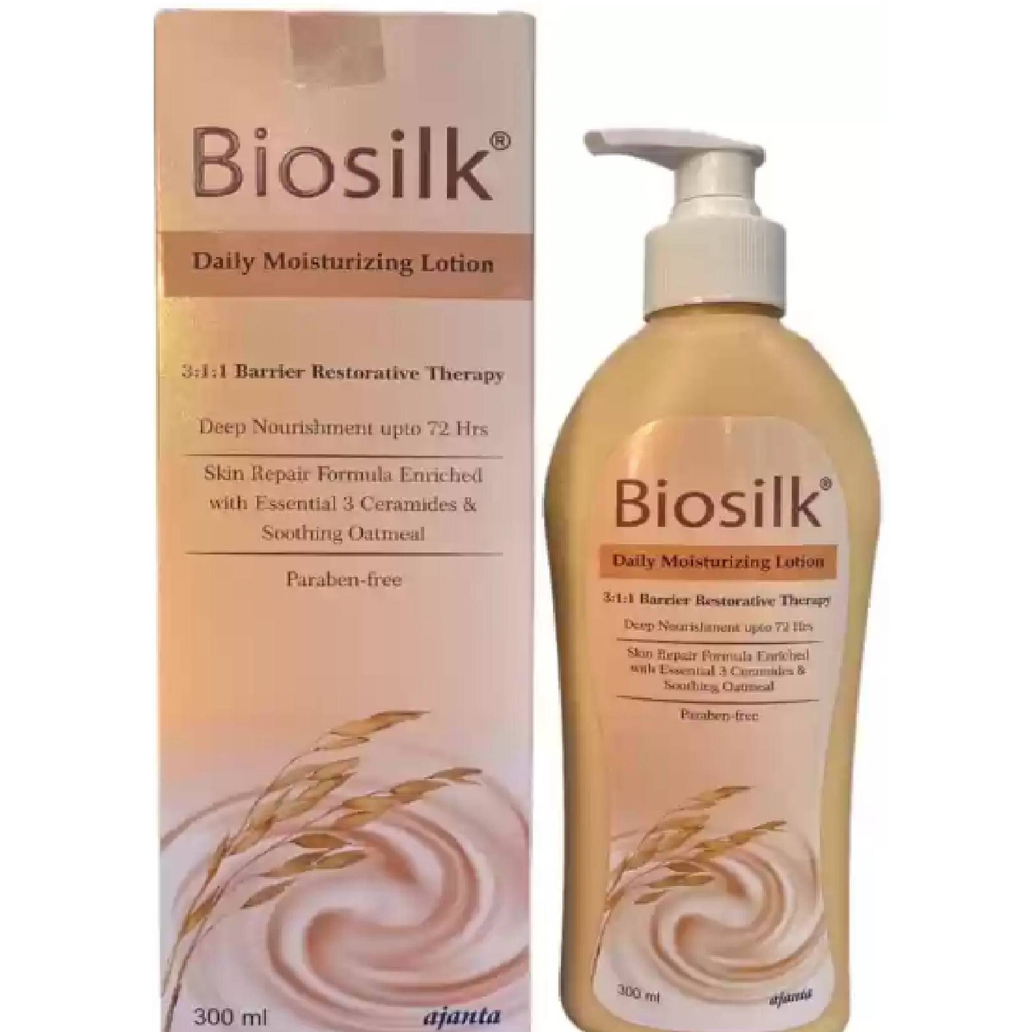Biosilk Daily Moisturizing Lotion contains a blend of oatmeal and ceramides, which can help moisturise and maintain the skin barrier. It can make the skin soft, silky, and hydrated. It may restore moisture and provide nourishment.